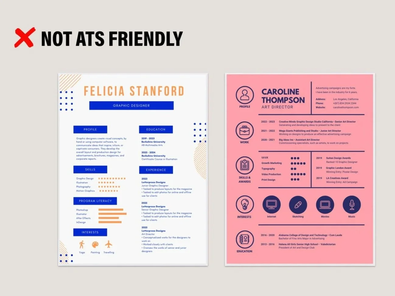 ATS tools work best with plain text documents and can have a more difficult time pulling information from highly-designed documents. As an artist or designer, you may want to have two versions of your resume, one which is optimized for ATS software and one that contains the design elements you prefer. Below you will see the types of design elements (multiple columns of text, graphics, etc.) that can be difficult for ATS to read.